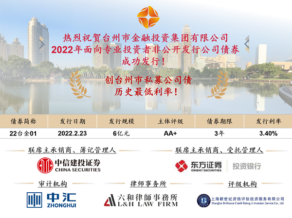 開年之際,市金投集團(tuán)于資本市場(chǎng)內(nèi)再嘗試再出發(fā)!集團(tuán)計(jì)劃財(cái)務(wù)部積極響應(yīng)國家、省、市政策號(hào)召與集團(tuán)融資工作部署,于2月23日成功面向?qū)I(yè)投資者非公開發(fā)行公司債券(私募公司債)6億元,創(chuàng)臺(tái)州市私募公司債歷史最低利率。