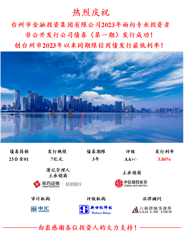 2023年4月11日,臺州市金融投資集團有限公司(以下簡稱市金投集團)面向?qū)I(yè)投資者第一期非公開發(fā)行公司債券(私募公司債)發(fā)行成功,揭開了市金投集團2023年發(fā)債的序幕。