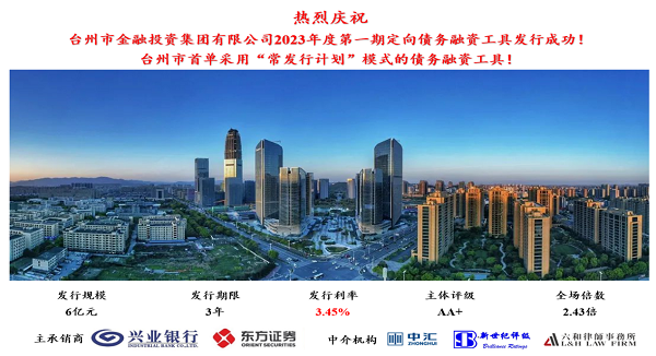 9月4日,市金投集團以“常發(fā)行計劃”方式成功發(fā)行6億元定向債務融資工具,發(fā)行期限3年,發(fā)行利率3.45%,為臺州市首單采用“常發(fā)行計劃”模式發(fā)行的債務融資工具。