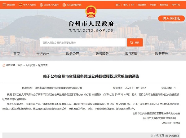 11月10日,臺(tái)州市政府與市金投集團(tuán)簽訂《公共數(shù)據(jù)授權(quán)運(yùn)營(yíng)協(xié)議》,標(biāo)志著市金投集團(tuán)成為臺(tái)州首家公共數(shù)據(jù)授權(quán)運(yùn)營(yíng)單位,依法開(kāi)展科創(chuàng)、綠色和小微普惠場(chǎng)景公共數(shù)據(jù)授權(quán)運(yùn)營(yíng)活動(dòng)。