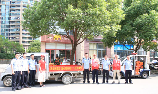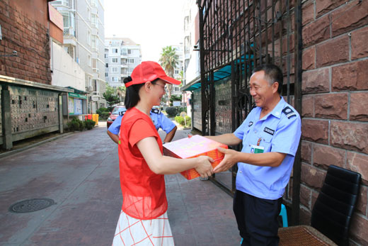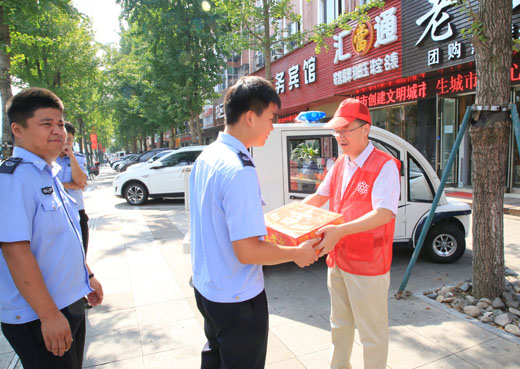 “送清涼”小分隊(duì)走進(jìn)星河苑小區(qū),志愿黨員代表呂志華為門口站崗的保安人員送上飲料,保安大叔笑開了花。