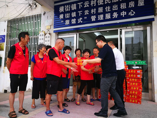 支部委員許長松攜駐村督導(dǎo)服務(wù)組成員陳力行趕赴橫街鎮(zhèn)下云村為當(dāng)?shù)氐纳鐓^(qū)志愿服務(wù)者以及環(huán)衛(wèi)工人送“清涼”。