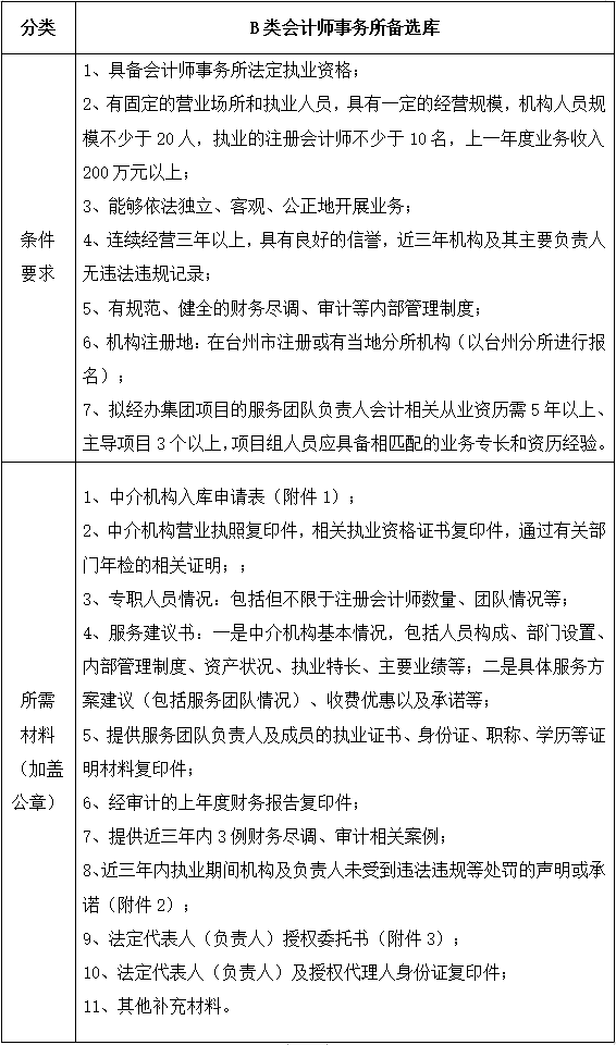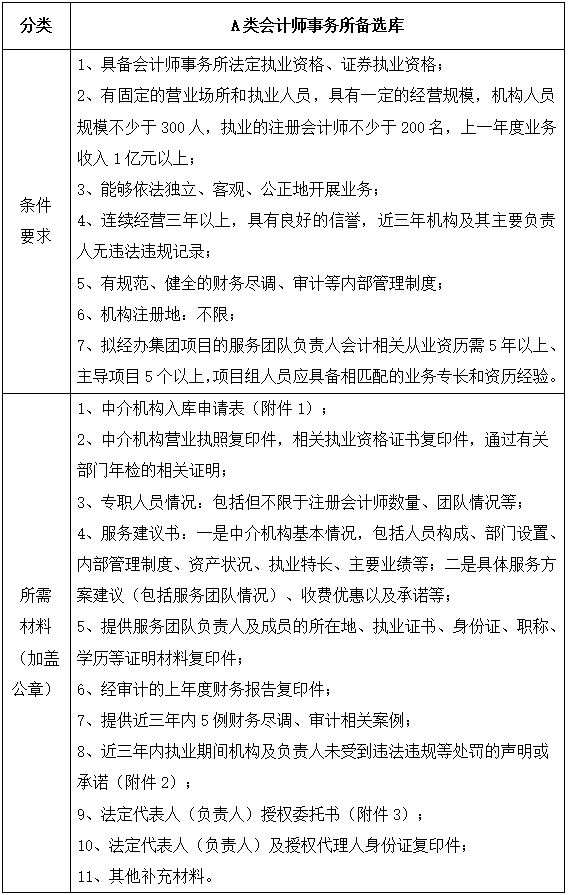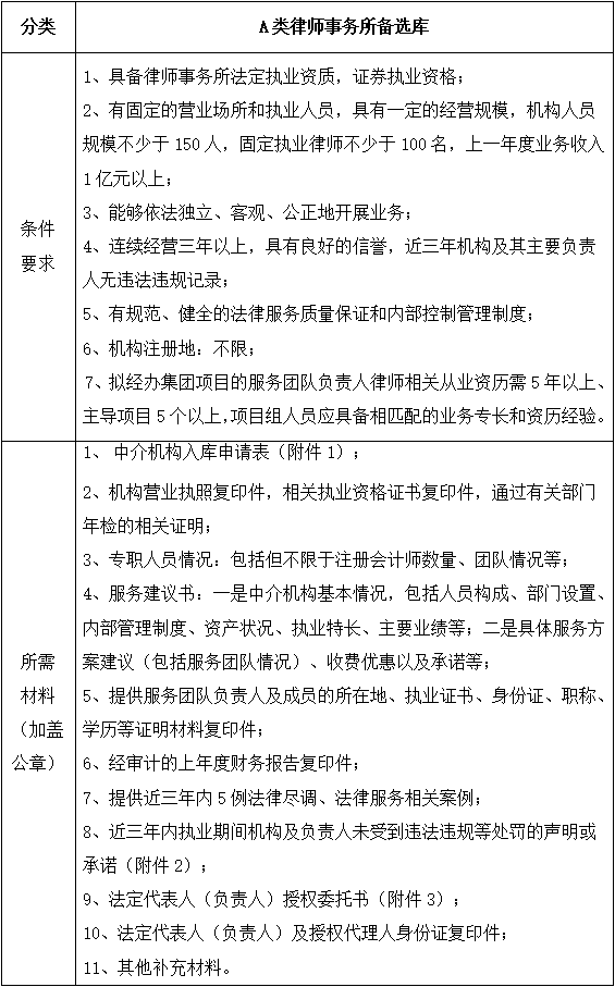 為更好的滿足集團(tuán)財(cái)務(wù)審計(jì)、財(cái)務(wù)盡調(diào)、法律服務(wù)、法律咨詢等專業(yè)服務(wù)需求,集團(tuán)擬對會計(jì)師事務(wù)所、律師事務(wù)所備選庫開展中介機(jī)構(gòu)入庫申報(bào)選聘工作,現(xiàn)將有關(guān)事項(xiàng)公告如下: