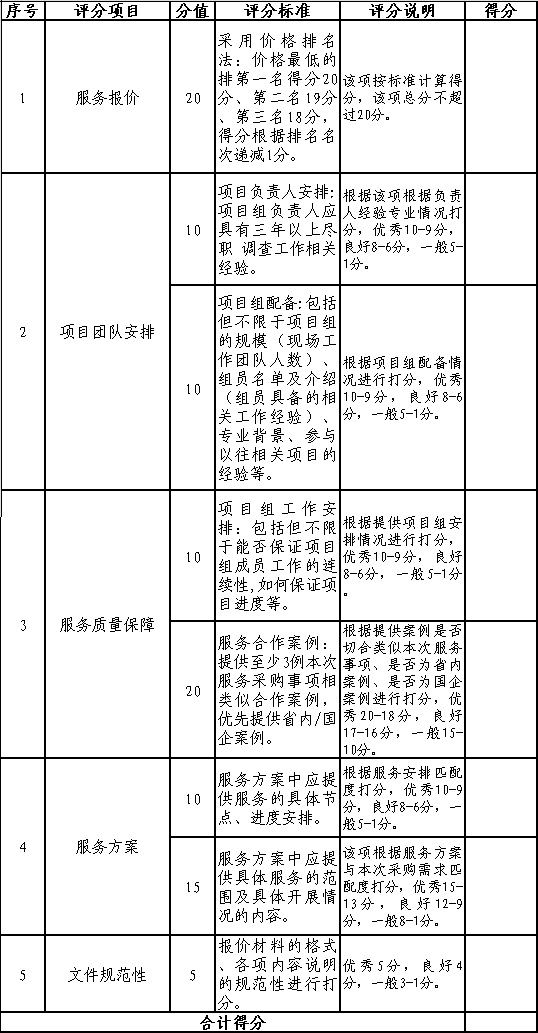 采用綜合比選方式,總得分為100分。根據評審結果,從高到低選擇1家服務供應商作為本次采購服務的合作機構。