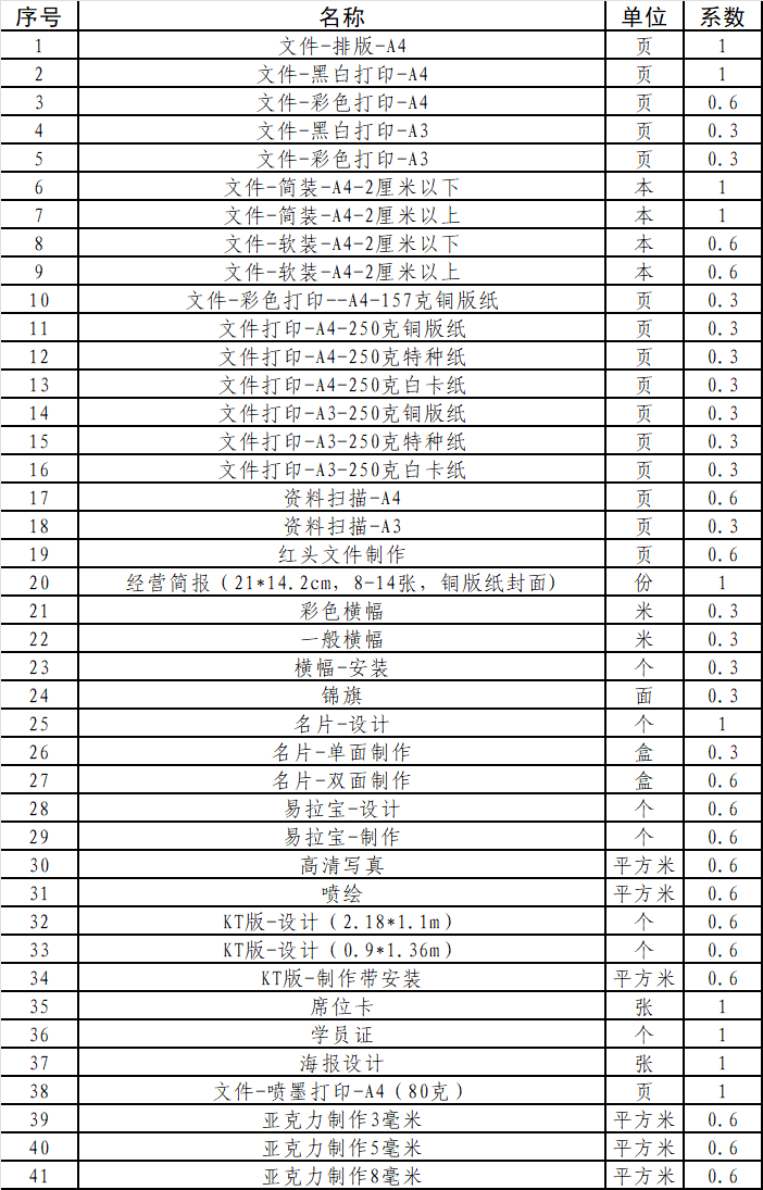 1.采購內容:選擇一家文印服務商簽訂服務協(xié)議,原則上服務期限不超過2年,每年續(xù)簽一次,若出現(xiàn)服務不到位的情況,公司有權重新采購或終止服務。文印服務包括但不限于下列清單。