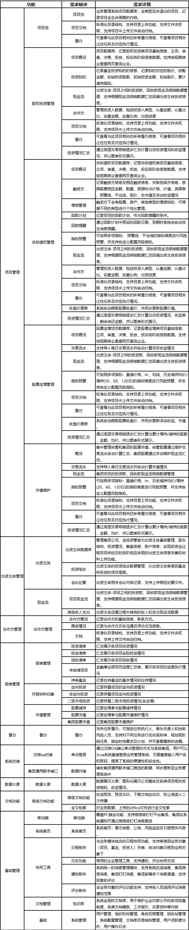 1.應(yīng)答方需根據(jù)我司現(xiàn)有的業(yè)務(wù)類型和管理模式等要求,開發(fā)一款適合我司的資管業(yè)務(wù)管理系統(tǒng)。系統(tǒng)具體需要實現(xiàn)的功能詳見下表: