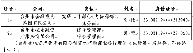 根據(jù)2023年4月27日發(fā)布的《臺州市金融投資集團有限公司及所屬企業(yè)公開招聘7名工作人員的公告》要求,經(jīng)公開報名、面試、體檢和考察等程序,確定以下人員為擬錄用人員,現(xiàn)公示如下: